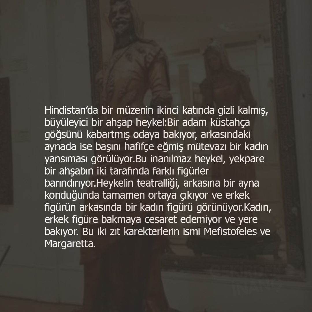 Hindistan’da bir müzenin ikinci katında gizli kalmış, büyüleyici bir ahşap heykel:Bir adam küstahça göğsünü kabartmış odaya bakıyor, arkasındaki aynada ise başını hafifçe eğmiş mütevazı bir kadın yansıması görülüyor.Bu inanılmaz heykel, yekpare bir ahşabın iki tarafında farklı figürler barındırıyor.Heykelin teatralliği, arkasına bir ayna konduğunda tamamen ortaya çıkıyor ve erkek figürün arkasında bir kadın figürü görünüyor.Kadın, erkek figüre bakmaya cesaret edemiyor ve yere bakıyor. Bu iki zıt karekterlerin ismi Mefistofeles ve Margaretta.İki taraflı heykelin, bu büyüleyici ikilinin Goethe’nin ikonik kitabı Faust’un karakterleridir.1808 yılında yayınlanan Faust, iyi ve kötünün klasik bir savaşıdır.Geniş bıyığı ve şeytani sırıtışıyla heykeldeki erkek figür açıkça Mefistofeles’tir (daha yaygın olarak şeytan diye bilinir). Kanı üzerine bir anlaşma yapan Faust bu anlaşmayı aslında şeytanla yapmıştır.Margaretta olarak da bilinen Gretchen’e aşık olduğunda ise bu anlaşma cinayet ve ebedi lanetlenme gibi çok vahim şeylerle sonuçlanacaktır.Hindistan Haydarabad’daki Salar Jung Müzesi’nde yer alan bu özel heykel, sanatçının hikâyeyi etkili ve adeta yaşatarak aktarabilme yeteneği açısından büyüleyicidir.19. yüzyılda adı bilinmeyen bir Fransız sanatçı tarafından bir Çınar kütüğünden ortaya konmuş bu eserdeki iki figür, Faust’ta da işlendiği gibi insanlığın iki kutuplu doğasının bir sentezidir.Bir tarafta sadece ukala bakışıyla bile korku yaratan kötü Mefistofeles var. Diğer tarafta ise şeytana bakmayı reddeden Gretchen…